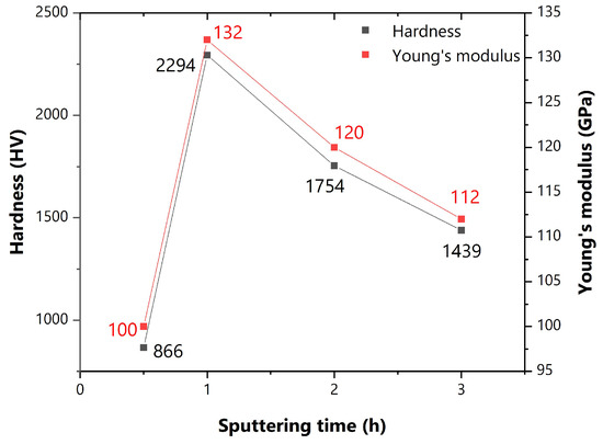 Evolution of hardness and Young’s modulus as a function of sputtering time of the FeCoNiTiAl coating. Based on [61].