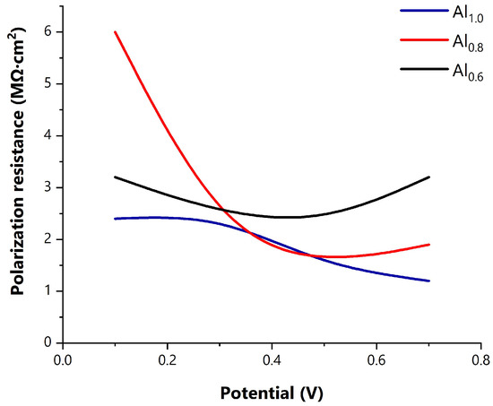 In the study of HEA AlCoCrFeNi (x = 0.6, 0.8 and 1) [62], different potentials for impedance spectroscopy (EIS) were used in the analysis of corrosion performance in saline environment infectious, with pH = 3 (Figure 9). In the content of 0.6 Al, the highest corrosion resistance was obtained due to the formation of a protective oxide layer, which was indicated by an increase in the low frequency impedance. Through the potential of +0.1 V, it was found that the alloy with 0.8 Al presented polarization resistance of about 6 Mcm2, the highest among HEAs. After increasing the potential to +0.7 V, AlCoCrFeNi stood out with greater resistance: approximately 3.3 Mcm2 [62].