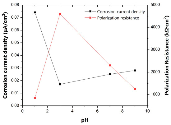 The surface corrosive behavior of HEA (TiZrNbTa)Mo [69] was evaluated in Ringer’s solution, observing that in all cases (pH 1, 3, 7, and 9), a protective oxide layer was formed. For pH = 1, the corrosion current density icorr and the polarization resistance Rp showed that the passive film protection deteriorated considerably. With pH = 3, the highest polarization resistance value was obtained: 4.7 Mcm2 (Figure 10) [69].