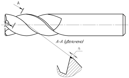 In our study, the value of wear along the rear surface of the cutter was chosen as the wear criterion. With an increase in this parameter, there was a sharp increase in cutting forces and an increase in wear, accompanied by chipping of the cutting edge. The wear chamfer along the back surface was measured in the plane normal to the helical cutting edge of the tooth, this parameter was designated by the letter hz (Figure 2). The width of the wear chamfer was measured with an optical microscope. The average wear value for four teeth was calculated. It should be noted that before the critical value, the wear mark on the back surface was quite clear, the scatter of the measured values of the wear chamfer did not exceed 7% of the average wear value, which indicates the reliability of the experimental data.