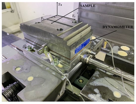 The cutting forces were determined using a Kistler 9257B dynamometer (Switzerland). The measurements were carried out in three mutually perpendicular directions (Figure 1). To evaluate the results, we used the total force acting in the plane perpendicular to the axis of the cutter. The dynamometer was mounted on a special plate and it was fixed in a vice on the milling machine. Before starting the experiments, mounting holes were drilled in the workpiece, and through these holes the workpiece was fixed on the dynamometer with four screws (Figure 3).
