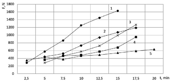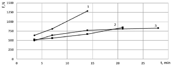 It is obvious that the increase in the forces in the investigated period of time is caused by the wear of cutters (Figure 8). The cutter operating at the speed of V = 50 m/min (Figure 8, curve 1) demonstrates the most intensive increase in the forces over the entire range under study. For the cutters operating at the speeds of 35 and 25 m/min, the increase in the cutting forces over time also correlates with the amount of wear, but is less intense than when cutting at the speed of 50 m/min.