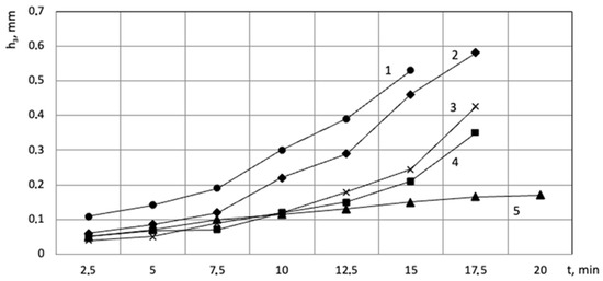 Graph of the dependency of flank wear land vs. the rake angle of the cutter: 1—γ = 12°; 2—γ = −7°; 3—γ = 8°; 4—γ = 0°; 5—γ = 4°.