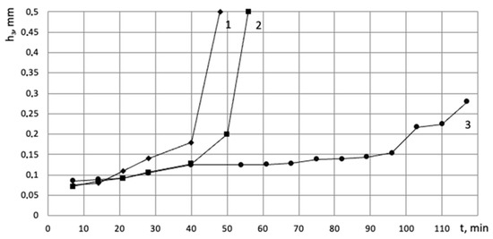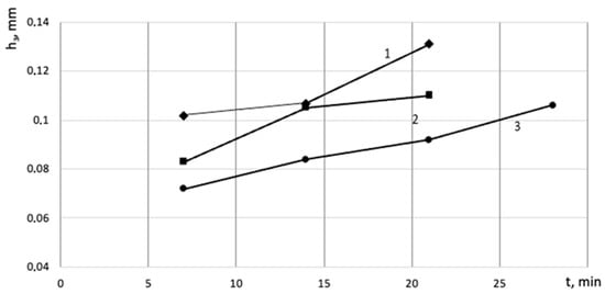 Graph of the dependency of wear vs. the cutting speed: 1—V = 50 m/min; 2—V = 35 m/min; 3—V = 25 m/min.