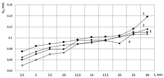 Figure 7 shows the graph of the flank wear land of the tooth vs. the time of operation of the cutter for the cutting speeds of 50, 35, and 25 m/min (curves 1, 2, and 3, respectively). It can be seen from the graph that the cutter operating at the cutting speed of 25 m/min sustained the least wear in the investigated period of time, so on the 28th min of operation, the flank wear land reached 0.11 mm. The cutter operating at the speed of V = 50 m/min had the highest wear, so the wear value reached 0.11 mm as early as on the 14th minute.