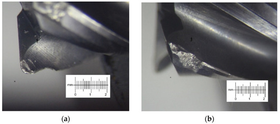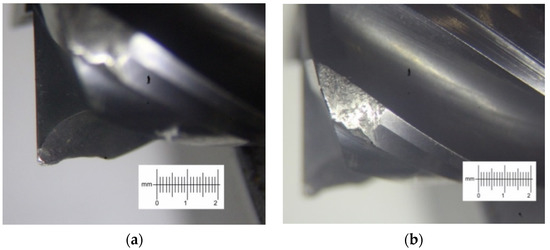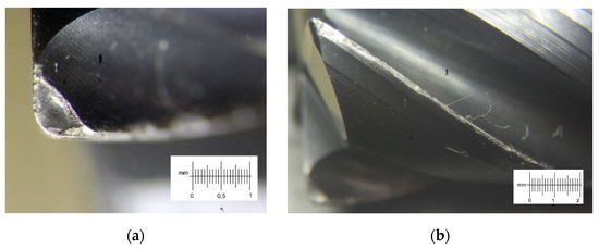 Based on the recommendations on the machining regimes of high-temperature alloys and the analysis of the literature [4,14,16], the feed per tooth of 0.04 mm/tooth and the cutting speed of 30 m/min were chosen for the experiments. The cutters were fixed in a collet chuck with identical overhang, 24 ± 0.5 mm. Moreover, for a qualitative and quantitative assessment of the experimental results, the wear of cutters and the cutting forces were measured.
