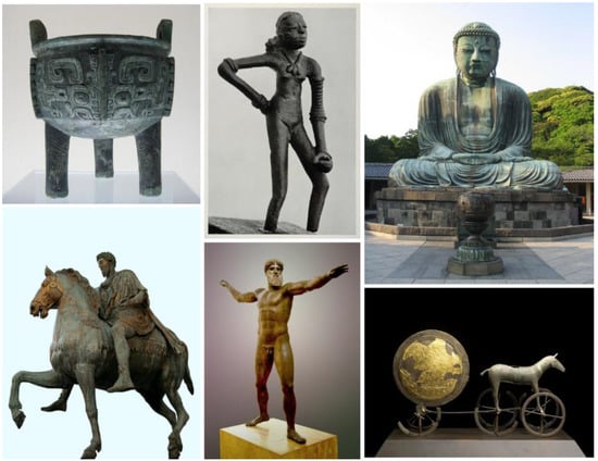 Metal casting is among the oldest primary shaping processes known to humanity. First examples of cast parts date back to several thousand years ago, when mainly copper-based alloys were used and processing typically relied on two-part stone or ceramic molds. Lost wax casting as a predecessor of modern investment casting appeared as early as 6000 years ago, possibly originating from the Indus valley civilization [1,2]. In Europe, the bronze castings of Greek antiquity mark a first highpoint of metal casting, again using mainly the lost wax technique [3,4]. Few full-scale statues remain from this time, and many are known only through contemporary descriptions, or Roman copies in marble or other materials. However, the basic technique of shaping an object by solidifying liquid metal in a mold has been discovered by many civilizations—examples spread over several cultures are collected in Figure 1, and the fact that some are missing here for reasons of space will hopefully not offend any reader.