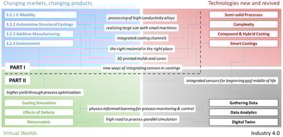 While the first industrial revolution had thus replaced manual labor with machinery and the second introduced mass production, the third is associated with computer numerical control and, thus, the implementation of automated systems as a replacement for human control. The fourth industrial revolution goes beyond this in handing over decisions otherwise made by humans to automated systems building on the evaluation of large amounts of data, very often using artificial intelligence (AI) approaches. For this process, in the midst of which we find ourselves today, terms such as Industry 4.0 and smart manufacturing have been coined—while Industry 5.0, which attempts to put the human at the center once again, already looms on the horizon [13]. The casting industry is affected by this trend just like any other manufacturing sector and responds by pressing ahead, at varied speed, with digitalization, advanced simulation approaches such as the digital twin concept adapted to its processes, and the extended use of artificial intelligence techniques.