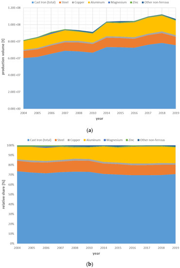 Graphical representation of the development of the relative importance of cast materials between 2004 and 2017 based on WFO data, as summarized in Table 2, (a) in absolute and (b) in relative numbers.