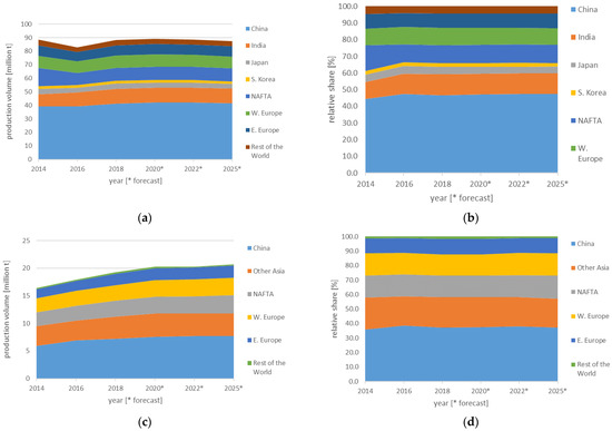 Prognosis regarding future development of the casting industry until 2025 based on data presented by Büchner [28], covering (a,b) cast iron and (c,d) aluminum alloys in terms of absolute (a,c) and relative (b,d) figures. See Table 3 for production data per material class, including others.