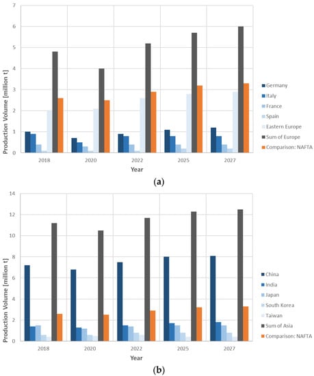 Projected development of the casting in industry according to the German Foundry Industry Association [29]: (a) Europe and (b) Asia, both with NAFTA data for comparison. Note the difference in the scale of the y-axis between (a,b).