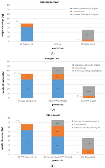 E-mobility’s impact on the weight of castings in the automotive powertrain; (a) subcompact cars, (b) compact cars and (c) mid-size cars [35,36].