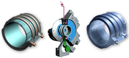 If HPDC is not mandatory and LPDC, sand casting or related processes can be employed, e.g., for smaller production rates, complex cores become an option. Examples of this kind have been demonstrated, e.g., by NEMAK [45] or Volkswagen in its ID.4. Among these, the Volkswagen solution is of specific interest, as it combines three castings: two lids produced via HPDC and a shell made by LPDC. The geometry of the latter is such that in future variants, replacement with an extrusion might be considered. If this could in fact be realized, it would allow for comparatively simple scaling of motor sizes by increasing or decreasing the length of the extrusion and, accordingly, the rotor and stator dimensions. A further alternative to LPDC is low-pressure sand casting, as suggested by Jin et al., who employ hot and cold box sand cores to realize the water jacket [46].