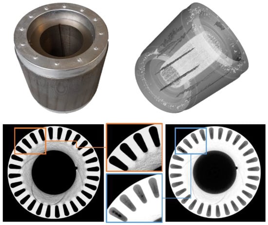 Rotor castings—Casting the short-circuit rings of an asynchronous electric motor’s rotor and the longitudinally connecting conductor bars between them is a challenge for two reasons at least: For one thing, what is required here is an alloy optimized not for its casting characteristics but for electrical conductivity. As the latter typically affords almost pure aluminum, the former is usually compromised. The issue is further complicated by the geometry of the casting, which almost inevitably leads to high levels of shrinkage porosity in the conductor bars, as these naturally solidify after the short circuit rings, making sufficient feeding almost impossible while potentially causing additional issues such as cold runs or flow front oxide layers hidden within the lamination stack [50]. The former effect is further stressed by the fact that highly conductive and thus low alloyed materials exhibit excessive levels of shrinkage compared to conventional casting alloys. Yun et al. report up to 7% of shrinkage and typical fill factors of aluminum die cast rotors between 85 and 98% [51]. To add to this, visualizing the porosity by X-ray computed tomography (CT) is rendered difficult by the extreme contrast in atomic number between steel and aluminum—however, advanced CT devices and reconstruction methods have recently been demonstrated to be capable of solving this problem ([50], see Figure 8 below). Against this background, alternative quality control approaches have been suggested, such as longitudinal X-ray scans along the axis of the bars [51] or methods based on electromagnetic flux injection [52]. An overview of such electromagnetic approaches is part of a study by Lee et al. [53].