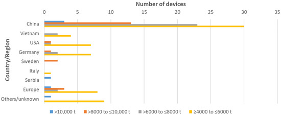 Overview of global orders for HPDC machines with locking forces of 4000 t and above, as compiled by Gärtner and Zhou [73]. Note that there is some ambiguity in the data: nine smaller HPDC machines in the “unknown” category are linked to Tesla—here, it is not clear with which Giga Factory they are associated. Similarly, a batch of 8 machines of 5500 tons purportedly ordered by Tesla from IDRA for Grünheide and Fremont has been evenly shared between USA and Germany here.