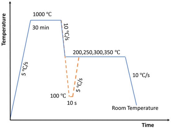 Schematic view of the different heat treatment schedules (temperature vs. time) used in this work.
