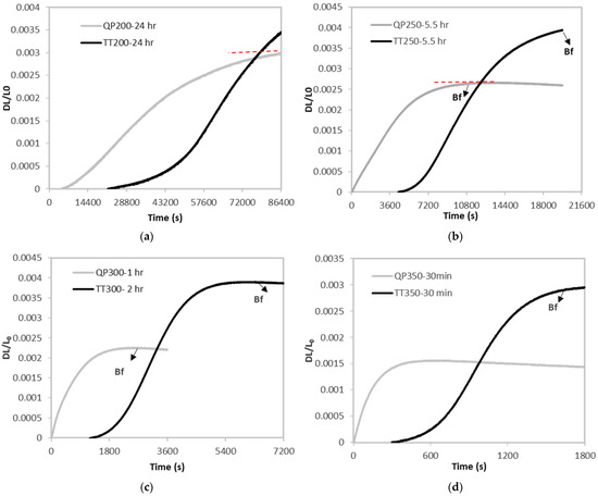 Dilatation during bainitic formation in one-step (TT) and two-step (QP) heat treatments: (a) 200 °C; (b) 250 °C; (c) 300 °C; (d) 350 °C.