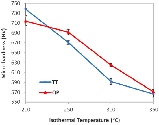 The hardness of the austempered (TT) and quenching-and-partitioning samples (QP) at a temperature of 350 °C is similar (570 HV). Moreover, the retained austenite phase fractions were similar. The hardness of the austempered sample (TT200) at a temperature of 200 °C is higher than the corresponding QP200 sample (738.3 versus 714 HV), while the retained austenite phase fraction is much higher, 36.8% versus 20%. The hardness of TT200 is higher than that of QP200, presumably due to the presence of fresh martensite [37,38,39].