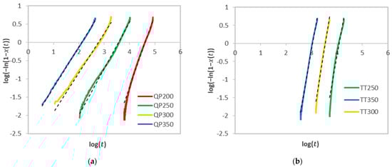 Linear fitting of log (−ln (1 − x(t)) and log(t): (a) QP (b) TT.