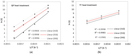 Arrhenius plot of ln(ti) versus 1/T used to determine the activation energy: (a) QP; (b) TT.