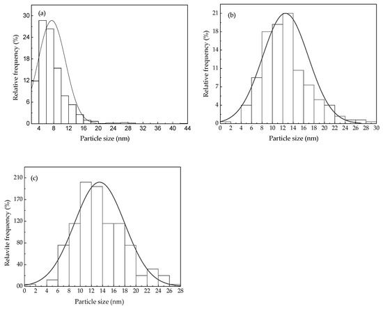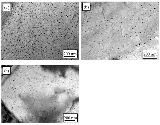 The size distribution of the precipitates in the HR, EF1, and EF2 samples is displayed in Figure 3. In order to accurately measure the size of the precipitates, 10 TEM photos were taken for analysis of each sample. The number of analyzed precipitates in the HR, EF1, and EF2 samples was approximately 8300, 1600, and 1200, respectively. The relative frequency of the precipitates is largest when the precipitate size is 2–4 nm in the HR sample, and when the precipitate size was approximately 12–14 nm and 10–12 nm in the EF1 and EF2 samples.
