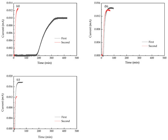 Current–time curves of hydrogen permeation test: (a) HR sample; (b) EF1 sample; (c) EF2 sample.