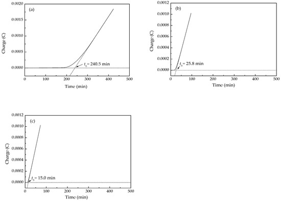 Charge–time curves of hydrogen permeation test: (a) HR sample; (b) EF1 sample; (c) EF2 sample.