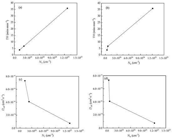 Relationship between TH, Deff, and NT, Nir: (a) TH–NT curve; (b) TH–Nir curve; (c) Deff–NT curve; (d) Deff–Nir curve.