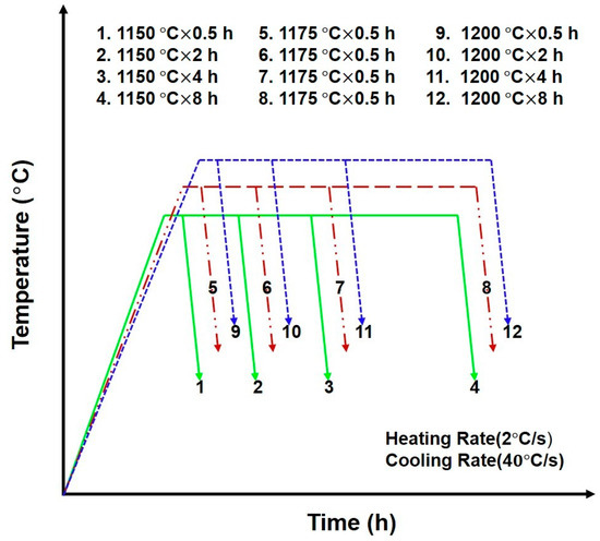 The solution heat treatment procedure is shown in Figure 1. All specimens were heated from room temperature to 1150, 1175, and 1200 °C with a heating rate of 2 K/s, held for 0.5, 2, 4, and 8 h, and then quenched to room temperature with a cooling rate of 40 K/s. It has been reported that the solvus temperature of the γ’ phase is about 1190 °C [24], which implies that the solution heat treatment with the temperatures of 1150 and 1175 °C belonged to the sub-solvus heat treatment, and the 1200 °C belonged to the super-solvus heat treatment. The heat-treated samples were sectioned, grinded, polished, and etched using the standard metallographic method. It should be noted that the samples were etched with a chemical etchant of 5 g of CuCl2 + 100 mL of HCl + 100 mL of ethanol. TESCAN VEGA3 scanning electron microscopy (SEM) (Tescan, Brno-Kohoutovice, Czech Republic), with secondary electron (SE) and back-scattering electron (BSE) mode, and optical microscopy (OM) were used for microstructure observation. OM images with ×150 magnifications were collected to evaluate the volume fraction of the TIP using an automatic image software. The relationships among the temperature, time, and the initial volume fraction of TIP were investigated using stereological metallography and image analysis according to the standard GB/T 15749-2008 [25].
