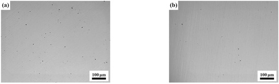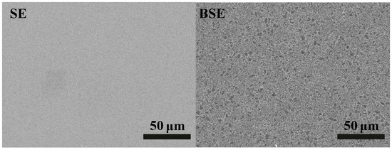 SEM images of the as-HIPed specimen (Ni3#) are shown in Figure 3; they were taken at the same position of the specimen’s cross-section but with different modes, with left being SE mode and right being BSE mode. Almost nothing could be detected in the SE mode; the deeper gray scale region in the BSE mode was identified as the γ’ phase. That means the SEM image with BSE mode was beneficial for observing the microstructure. The details of the evolution of the precipitate during the HIP process and subsequent solution heat treatment are not shown here. It is difficult to distinguish the γ’ phase from the TIPs, as they have a similar grayscale, regardless of whether they are in SE or in BSE mode. Therefore, OM images were selected for TIP evaluation, not only because they have a greater view field than SEM images, but also because they are beneficial for statistical analysis.