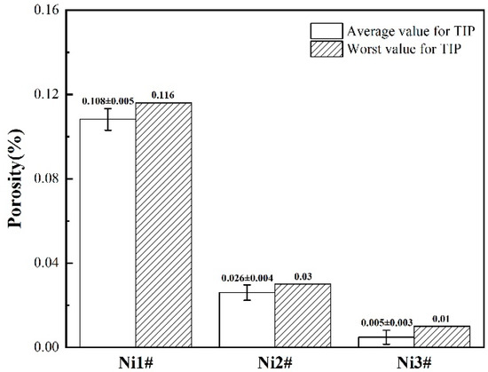 The volume fractions of the TIP based on OM images of Ni1#, Ni2#, and Ni3# superalloys were statistically analyzed, respectively. The TIP values of the as-HIPed FGH97 superalloys are presented in Figure 4. The result showed that there was a significant difference in the TIP volume fractions between the two measurement methods mentioned above, but they had the same trend. The Ni1# superalloy had the highest TIP value, followed by the Ni2#, and the Ni3# had the lowest value, which is consistent with the findings of the OM observation shown in Figure 2. It also demonstrated that the HIP conditions, such as vacuum level and compactness of the container, had remarkable impacts on the TIP values of the nickel-based superalloys.