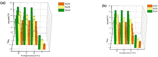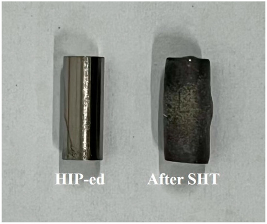 The specimens were deformed after the solution heat treatment, particularly for the specimen held at a higher temperature and for a longer term; the shape of the cylinder was transformed into a drum, which can be seen in Figure 8. Compared with the cylindrical as-HIPed specimen, the solution heat treatment caused a severe and irregular deformation and even lead to specimen explosion. All Ni2# specimens exploded when the holding time increased to 8 h, regardless of the holding temperature, because the pressure of the trapped gas inside the TIPs exceeded a critical value and may cause permanent dimensional changes [30].