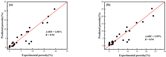 The deviation of the calculational porosity from the experimental results was investigated quantitatively by using two parameters, the correlation coefficient () and average absolute relative error (AARE), as expressed in Equations (5) and (6).