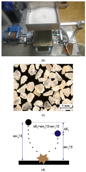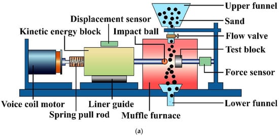 The photo and drawing of the impact wear tester are shown in Figure 1a,b, respectively. A sand particle device and a high-temperature muffle furnace device were added to the impact wear tester with variable kinetic energy to realize the environment of high temperature and sand particles. The specific operation process of the testing machine is as follows: (1) Under the control of the software and hardware of the equipment, the voice coil motor moves linearly back and forth in sine or cosine mode; (2) when the speed reaches the maximum, the kinetic energy block is separated from the spring pull rod and rebounds (the rebound speed is Vi) after impacting the sample (the impact speed is V0); (3) after impact, the voice coil motor moves the kinetic energy block backward through the spring pull rod until it returns to the initial position to complete the impact action of the whole cycle. Before the start of the test, the power supply of the high-temperature muffle furnace is turned on and adjusted to the predetermined temperature. Then, the flow-regulating valve is opened and adjusted to enable the sand in the funnel to flow out at a constant flow rate. Sand should be added while waiting for the temperature to reach the predetermined value. After reaching the predetermined temperature, activate the voice coil motor is to begin the impact test. In this experiment, the displacement and force sensors detect the displacement of the punch and the force on the specimen before and after the impact of the kinetic energy block, and the velocity of the kinetic energy block can be obtained by differential derivation of the displacement. Energy loss during impact ΔEi can be obtained by calculating the difference between the kinetic energy of the kinetic energy block before impact and the kinetic energy after impact, as shown in Figure 1d.
