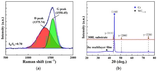 Figure 3a shows a wide Raman peak between 1000 and 1750 cm−1 in Raman spectra and the wide Raman peaks are fitted as D peak and G peak, which are located at 1375.74 and 1550.45 cm−1, respectively. The intensity ratio of the D peak to the G peak of the Raman spectrum (ID/IG) was 0.70. The D peak is due to the breathing modes of sp2 carbon atoms in rings. The G peak is due to the bond stretching of all pairs of sp2 carbon atoms in the rings and chains [28]. The prepared Cr/W-DLC/DLC multilayer films presented the Raman spectral characteristics of typical amorphous carbon [29,30]. Figure 3b shows the XRD pattern of the prepared multilayer film and 308L substrate. There are mainly diffraction peaks of WC1−X and Cr in the XRD pattern of Cr/W-DLC/DLC multilayer films, indicating the amorphous characteristics of the DLC film. The Cr diffraction peak mainly comes from the transition layer between the films, while the WC1−X diffraction peak comes from the metastable β-WC1−X nanocrystalline component formed in the interlayer W-DLC film [15,31]. The substrate has three diffraction peaks at 2θ = 43.60°, 50.74°, and 74.62°, which indicate γ-(111), γ-(200), and γ-(220) crystal plane, respectively. This means the 308L substrate is composed of a single austenite [32].