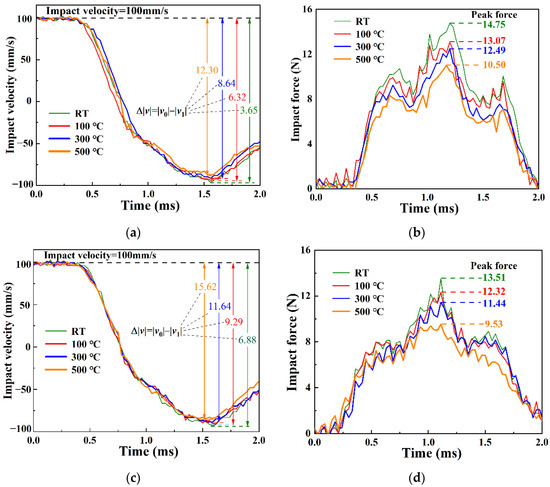 - The rebound velocity and the peak contact force under sand conditions are lower than under no-sand conditions at the same temperature. This finding indicates that more energy is absorbed for plastic deformation and material removal under sand conditions.
