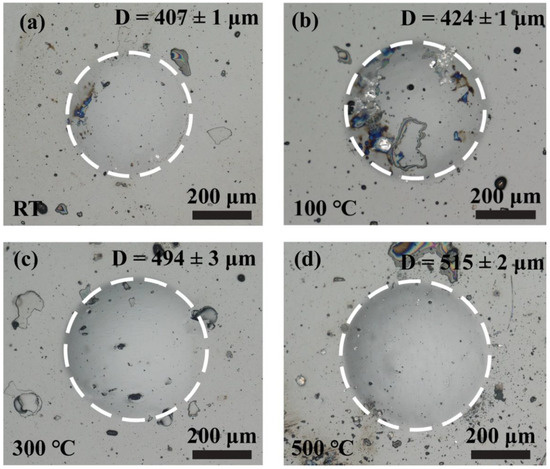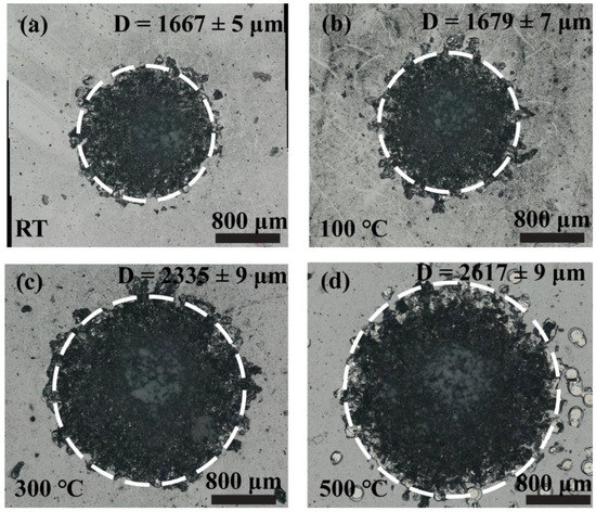 Figure 5 shows the surface topography of Cr/W-DLC/DLC multilayer films without sand. When the impact cycle is 104, the area of impact increase gradually with the temperature rise. The diameter of wear areas increases from 407 μm at RT to 515 μm at 500 °C. This finding may be due to the decrease in substrate hardness (substrate softening) caused by the increase in temperature [33,34]. The surface topography of Cr/W-DLC/DLC multilayer films shows no cracks and coating damage in the wear area. This condition indicates the film has good adhesion properties and thermal stability [35]. At the same time, the considerable increase in temperature did not cause the significant increases in wear area because work hardening occurs on the surface of the wear scars during the impact process, thereby increasing the surface strength and improving the wear resistance [36].