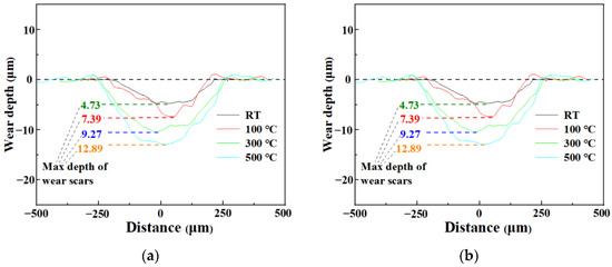 Figure 7 shows the wear scar profiles of Cr/W-DLC/DLC multilayer films under no sand conditions and sand conditions at various temperatures. Whether under a sand or no-sand condition, the max depth of impact increases gradually with the increase in temperature. The max depth of wear scars is from 4.73 μm at RT to 12.89 μm at 500 °C, indicating an increase of nearly two times. This finding may be due to the softening of the substrate caused by the rise in temperature, resulting in more severe plastic deformation during the impact process [34]. The wear scar profiles of Cr/W-DLC/DLC multilayer films show that the surface of wear scars under sand conditions is rougher than that under no sand conditions. This finding also indicates that adding sand particles aggravates the wear of Cr/W-DLC/DLC multilayer films under the same experimental conditions [40].