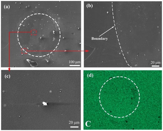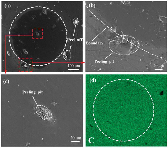 Figure 8 and Figure 9 show the wear scar topography and element distribution of Cr/W-DLC/DLC multilayer films at RT and 500 °C under no sand conditions, respectively. Pits due to plastic deformation are clearly visible at RT or at 500 °C. After the plastic deformation of the 308L substrate, the tensile stress produced by the films may lead to cracks and spalling of films [41]. However, the films are not seriously worn except that the C layer has a slight peeling pit at 500 °C. Figure 8d and Figure 9d show that only C element was detected in EDS mapping data of wear scar surface, confirming the integrity of the Cr/W-DLC/DLC multilayer films. A smooth surface without wear debris can prove that the wear mechanism is plastic deformation at various temperatures under no sand conditions [42].
