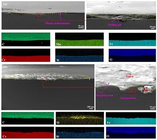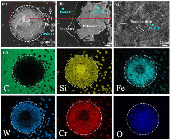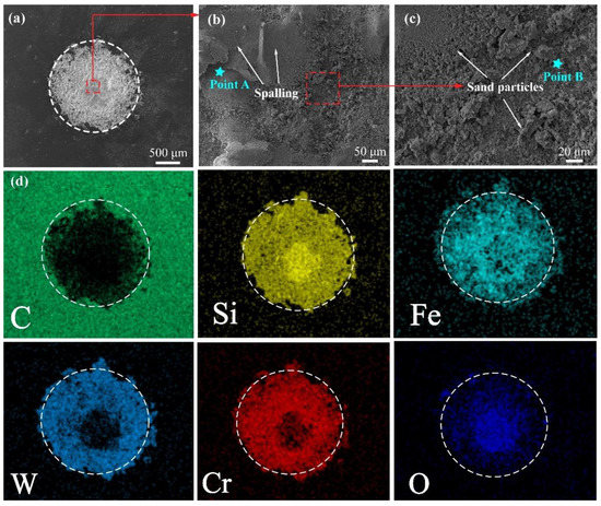 Figure 10 and Figure 11 present the wear scar topography and elemental distribution of Cr/W-DLC/DLC multilayer films at RT and 500 °C under sand conditions, respectively. The chemical compositions of points A to F are presented in Table 2. Evident cutting and ploughing tracks are found at wear scar areas at RT or at 500 °C. As shown in Figure 10b and Figure 11b, the film was broken at the wear areas, and delamination and spalling of the film occurred. The significant enrichment of Fe in Figure 10c and Figure 11c show that the substrate is exposed after the coating is damaged. And Fe elements detected from points B and F also prove the damage of the film. The enrichment of Si proves the existence of sand particles in the wear scar area. Si elements are also detected from points A, B, and F in Table 2. Compared with the impact ball, the edges and corners of sand particles may increase the contact stress and damage the films quickly. Compared with RT, the substrate softens at high temperatures and the wear is more severe after the films are broken [39]. The mechanism of impact wear with sand is mainly abrasive wear. Evidently, film spalling also exists in high-temperature and sand particle environments [38]. Figure 12 shows the impact mechanism of Cr/W-DLC/DLC multilayer under no-sand condition and sand condition. Figure 12a shows the schematic of the impact mechanism of Cr/W-DLC/DLC multilayer films under no sand condition. The multilayer film has severe plastic deformation, but the wear scar surface is smooth and the film does not peel off completely. Figure 12b shows the schematic of the impact mechanism of Cr/W-DLC/DLC multilayer films under sand conditions. The embedded sand particles can cut and plough the wear scar area and make the film delaminate and peel off seriously.