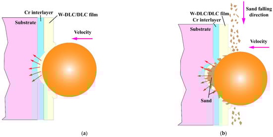 The impact mechanism of Cr/W-DLC/DLC multilayer under (a) no-sand condition and (b) sand condition.