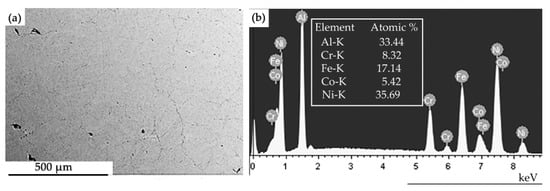 X-ray microanalysis showed that the HEA is formed by the chemical elements Al, Cr, Fe, Co, Ni in the following ratio (at. %): 33.4Al-8.3Cr-17.1Fe-5.4Co-35.7Ni (Figure 2). A small unindexed peak near 1.8 KeV belongs to silicon, its relative content is low (2.3 at.%). It is obvious that silicon is an uncontrolled impurity of aluminum.