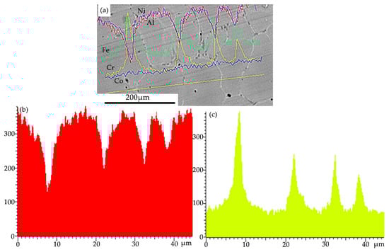 Results of X-ray microspectral analysis of HEA sample section (a), obtained by the “along the line” method (blue line: Co; yellow line: Cr; green line: Fe; red line: Al; purple line: Ni); (b,c)—distribution of the intensities of characteristic X-ray emission of Al (b) and Cr (c) atoms along the line indicated in (a).