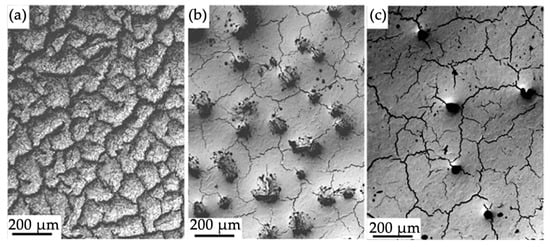 Electron microscopic image of the surface structure of the “film (Cr + B)/(HEA) substrate” system irradiated with a pulsed electron beam at electron beam energy density (J/cm2) of 20 (a), 30 (b), 40 (c).