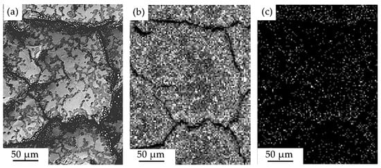 Electron microscopic image of the surface structure of the “film (Cr + B)/(HEA) substrate” system irradiated with a pulsed electron beam (20 J/cm2) (a); (b,c)—images of the sample area (a) obtained in the characteristic X-ray emission of Cr (b) and B (c) atoms.