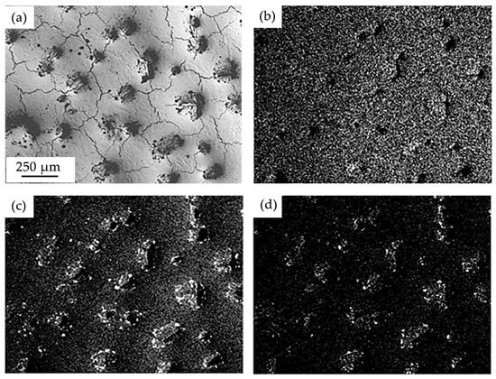 Electron microscopic image of the surface structure of the “film (Cr + B)/(HEA) substrate” system irradiated with a pulsed electron beam (30 J/cm2) (a); (b–d)—images of the sample area (a), obtained in the characteristic X-ray emission of Cr (b), Al (c) and O (d) atoms.