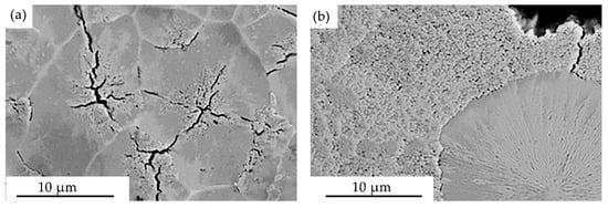 Electron microscopic image of the surface structure of the “film (Cr + B)/(HEA) substrate” system irradiated with a pulsed electron beam at electron beam energy density (J/cm2) of 30 (a) and 40 (b).
