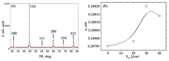 Fragment of the X-ray diffraction pattern of HEA surface layer modified by irradiating the “film/substrate” system with a pulsed electron beam at ES = 30 J/cm2 (arrows indicate indices) (a); (b)—dependence of the HEA lattice parameter on the energy density of the electron beam.