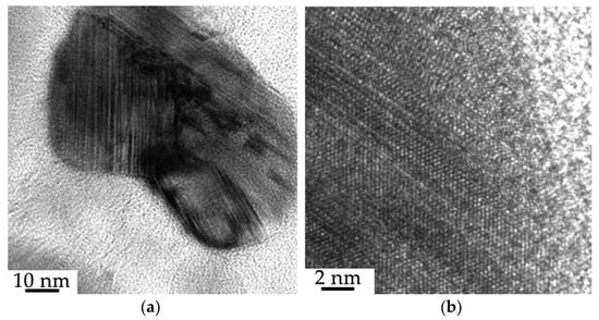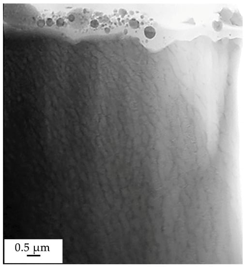 The modified surface layer is characterized by the presence of formations of a spherical shape, the dimensions of which vary from units to hundreds of nanometers (Figure 11). It was established by methods of direct resolution of the crystal lattice that the particles are crystalline formations (Figure 12a); these particles are located in the layer having an amorphous structure (Figure 12b).