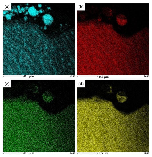 The mapping method was used to visualize the distribution of atoms in the bulk of the alloy (Figure 3). It is shown that the boundaries of grains and dendrites are enriched in chromium and iron atoms; the volume of grains is enriched with aluminum, nickel, and cobalt atoms. Thus, the additive-manufactured alloy is characterized by the separation of chemical elements.